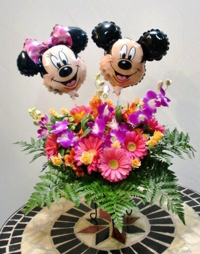 ミッキー&ミニーのバルーンが付いたミニスタンド花!結婚式の贈りものに人気があります♪ 厳選送料無料! ミッキー&ミニーの仲良しミニスタンド 季節のお花 アレンジメント 6000円 メッセージカード無料