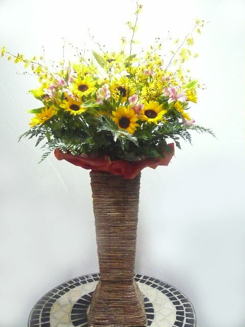スタンド付きアレンジメント。 開店、誕生日などお祝い、インテリア、ビジネス使用にもどうぞ。 法人様には領収書の発行が可能です。 厳選送料無料! フラワースタンド花 (ミディアム) ひまわり入り 黄色系